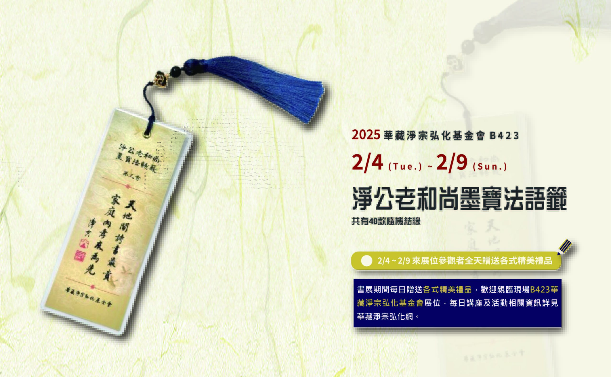2025台北國際書展於 2/4~2/9在台北世貿一館展出,華藏淨宗弘化基金會/華藏淨宗學會再次參展,展位在B423,學會多年來致力於佛教典籍的整理及流通,幫助大家更容易了解佛法,並通過修習佛法獲得更有品質的生活,身心輕安喜悅,這也是我們這次參加書展的願望。