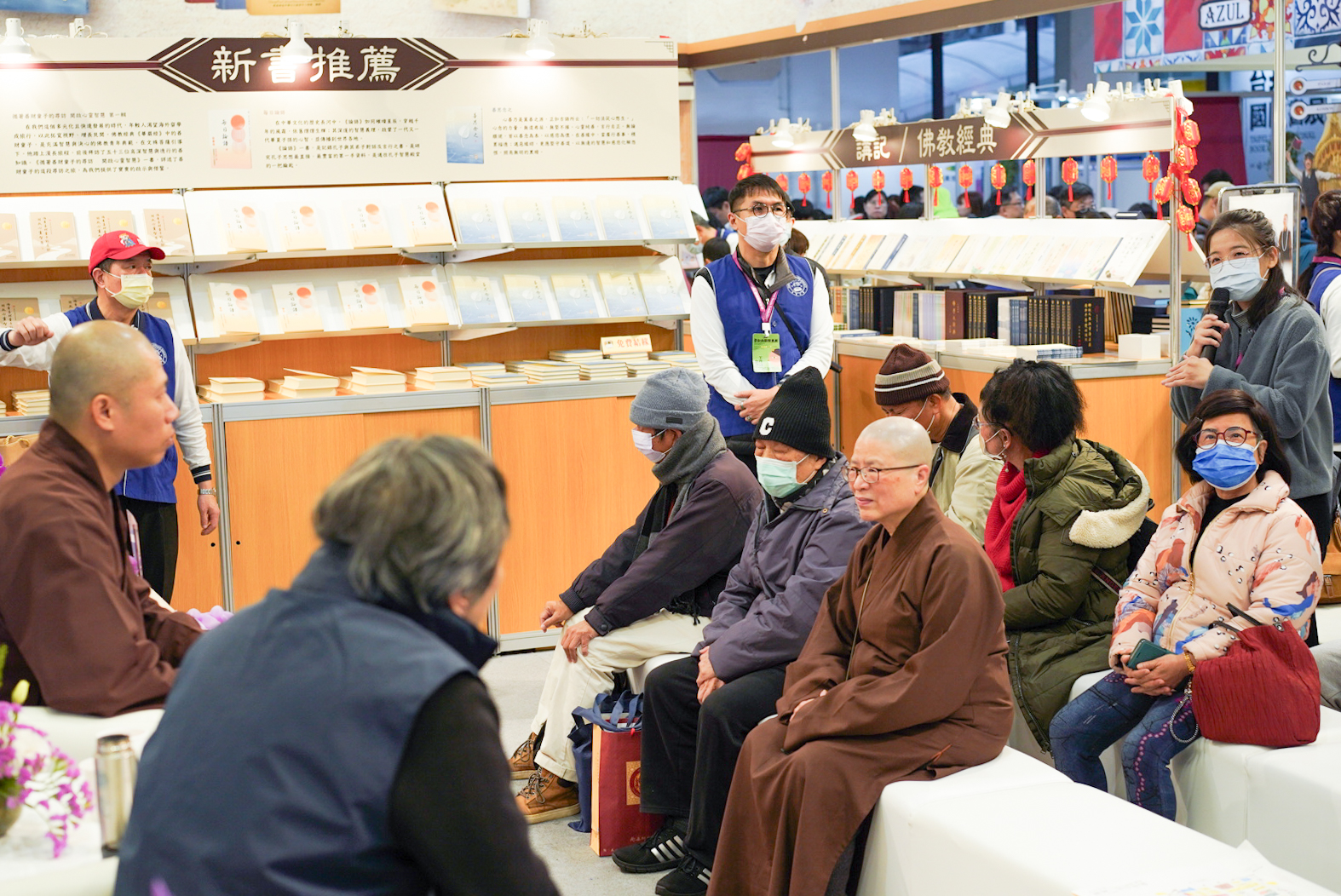 其次,我們由衷感謝吳雅玲老師,在書展前協助培訓義工的儀態及接待禮儀,並在書展期間主持座談會,與來賓共同探討、分享對佛法的理解與感悟。此外,吳老師還為觀展的朋友介紹了《認識佛教》一書,並分享了她的讀書心得,讓大家對佛法有了更深入的認識。同時,我們也要感謝滿居士在書展期間,為來賓朋友介紹了《佛說阿彌陀經》、《觀無量壽佛經》、《金剛經》、《心經》等重要的大乘經典,讓更多人接觸到佛法的精髓。