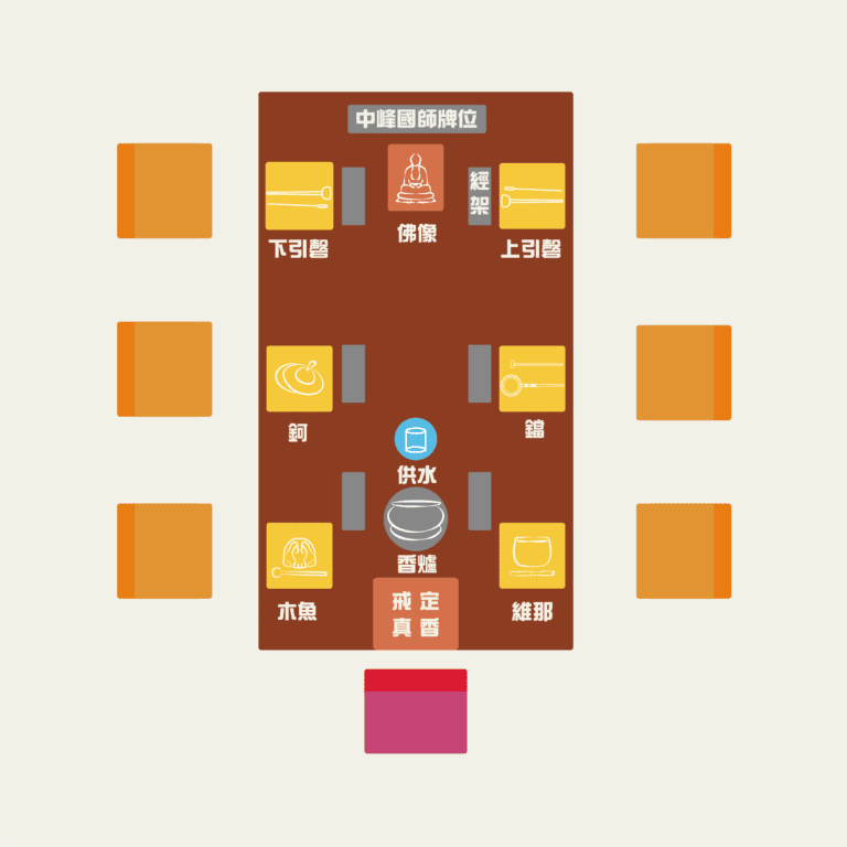 悅眾法師們的座位採用面對面的方式設置(鼓的設置不在此區)。