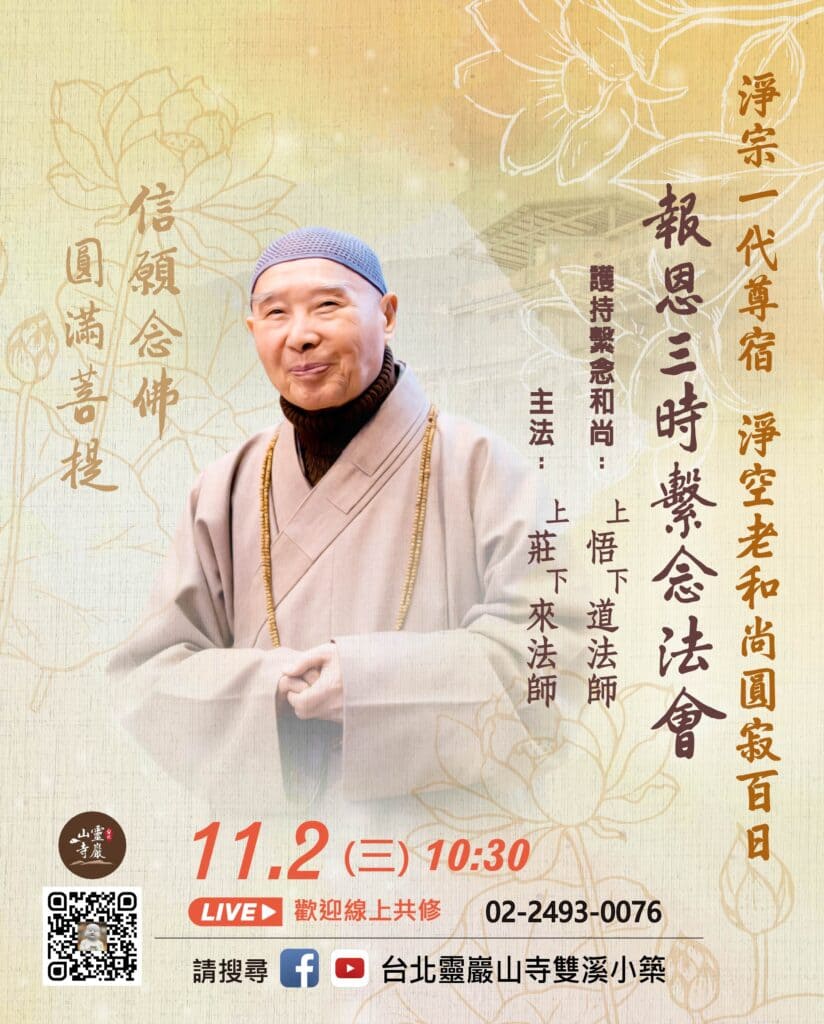 首頁 > 最新消息 > 法會講經 > 法會 > 11/2線上直播共修|淨宗導師 上淨下空老和尚圓寂百日報恩三時繫念法會