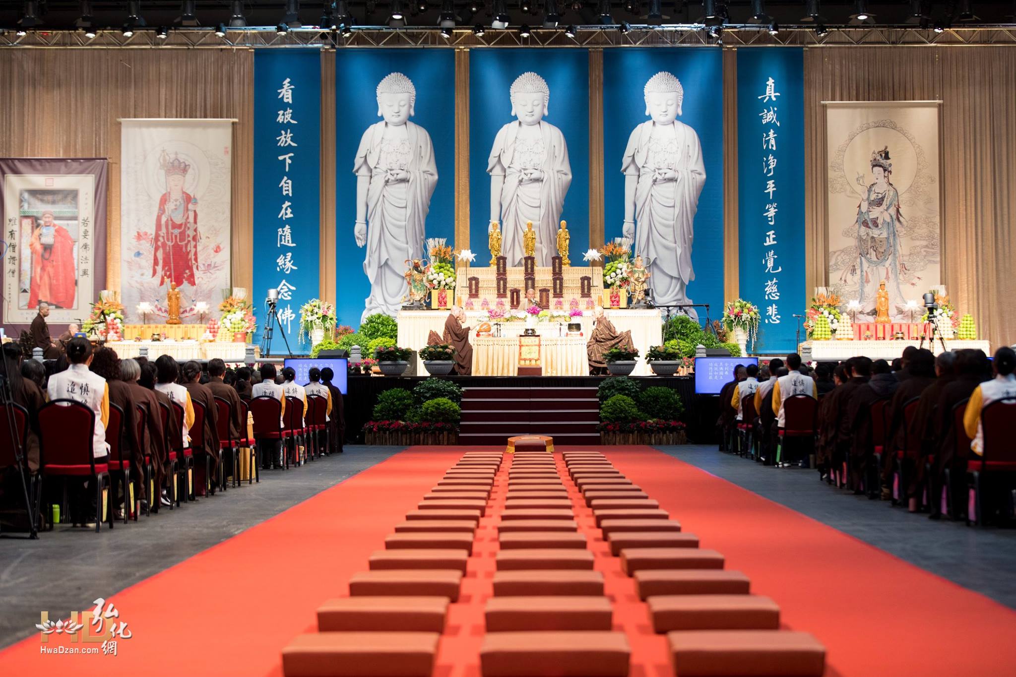 在寬廣的會場裡面,九千張座椅分成左右兩邊,整齊地排列著。會場正中留出空間,前後兩面懸掛著巨幅的佛像。