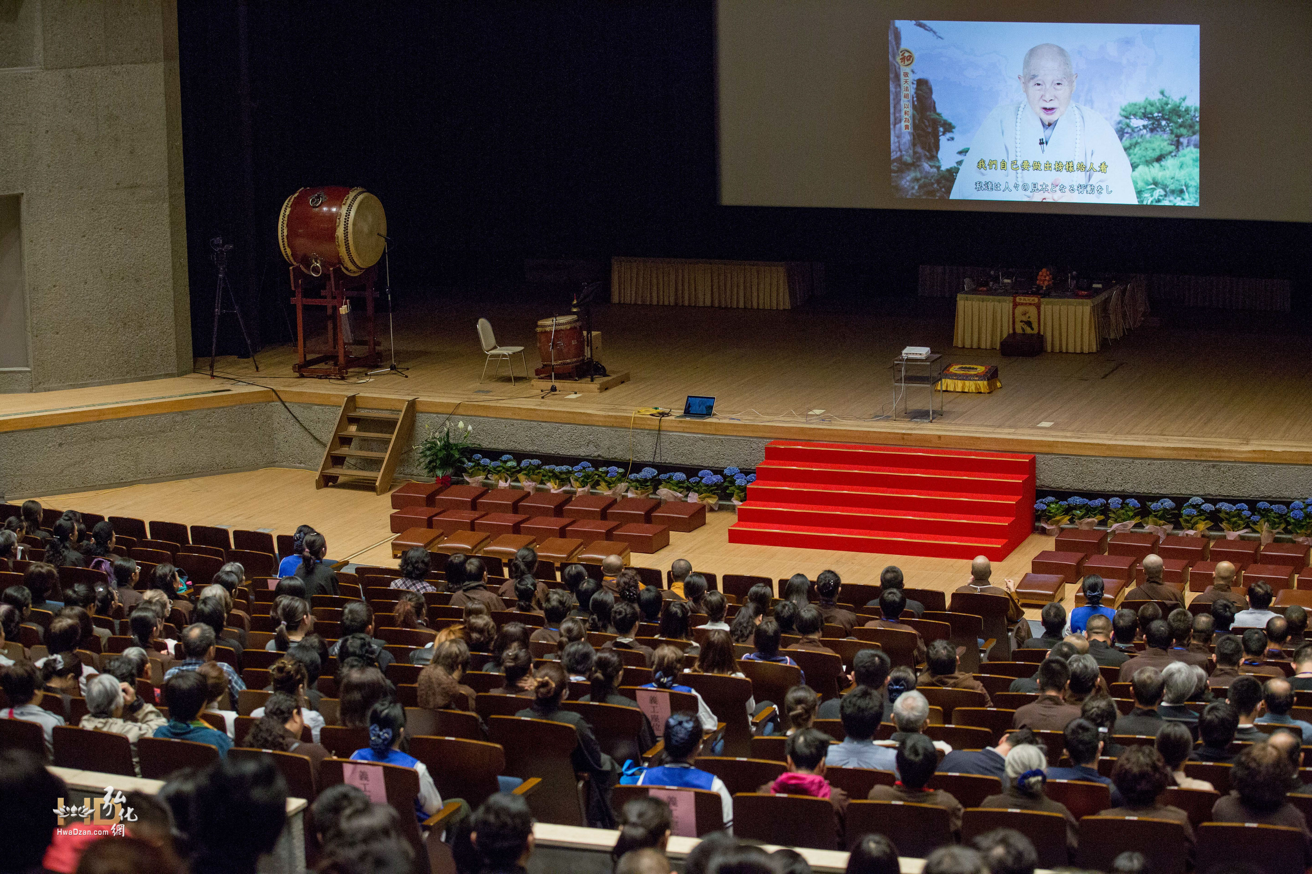 上午九點半,會場播放上淨下空老法師預先錄製的談話《敬天法祖 以和為貴》。